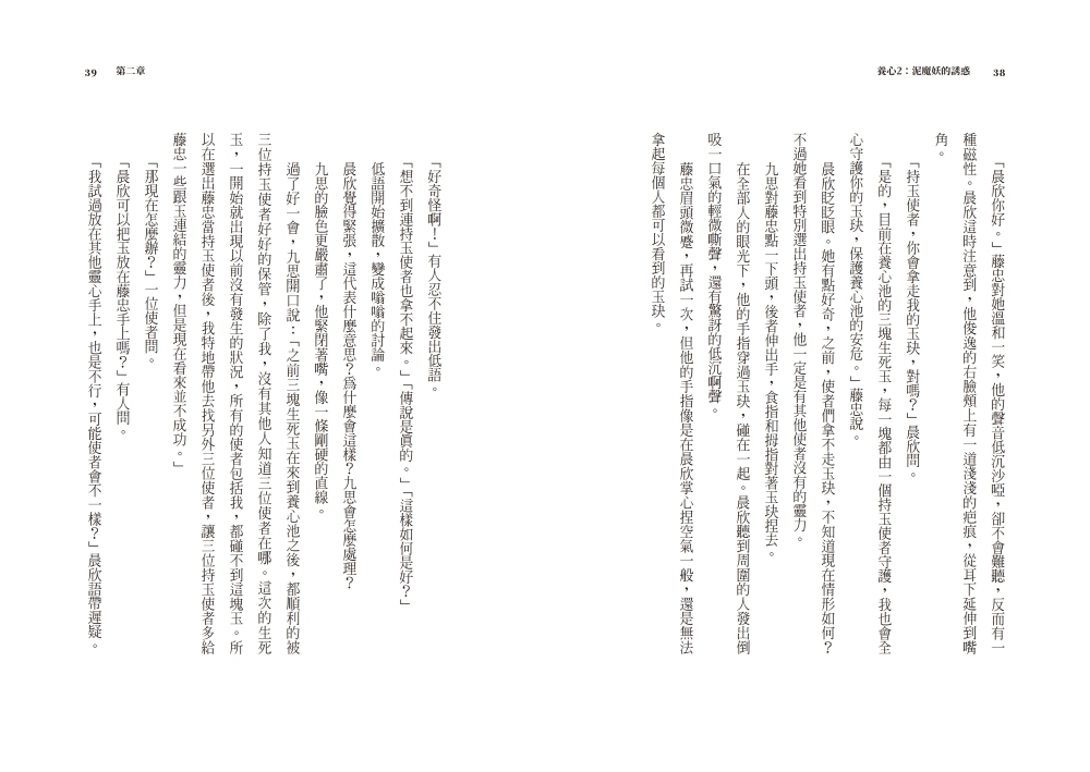 晨欣因一起意外來到冥靈界,她既渴望重返物人界,得知母親被帶往滯心澤之後,又渴望前去搭救母親。第一集,晨欣找了她「生前」的朋友艾美為夥伴,豈料隨著劇情層層推進,晨欣恍然大悟,她的死去,部分是艾美的私心所促成。我澈底被晨欣與艾美又親暱又緊張的情誼給打動。《養心2:泥魔妖的誘惑》,一個晨欣信任的角色,也陷入跟晨欣對立的局面。陳郁如並不是用最簡單、易懂的「背叛」來打發讀者,相反的,她細細的分梳、解釋,為什麼有時我們親近的人會一步步走向我們所陌生的道路。每個人內在都有兩種聲音,一個提醒我們多加為他人著想,一個要我們專注於私慾。回到那個古老的故事,每個人心裡都有兩隻狼,一隻象徵光明,一隻象徵黑暗,哪一隻狼占上風?存乎於「我們更常餵哪一隻狼」。