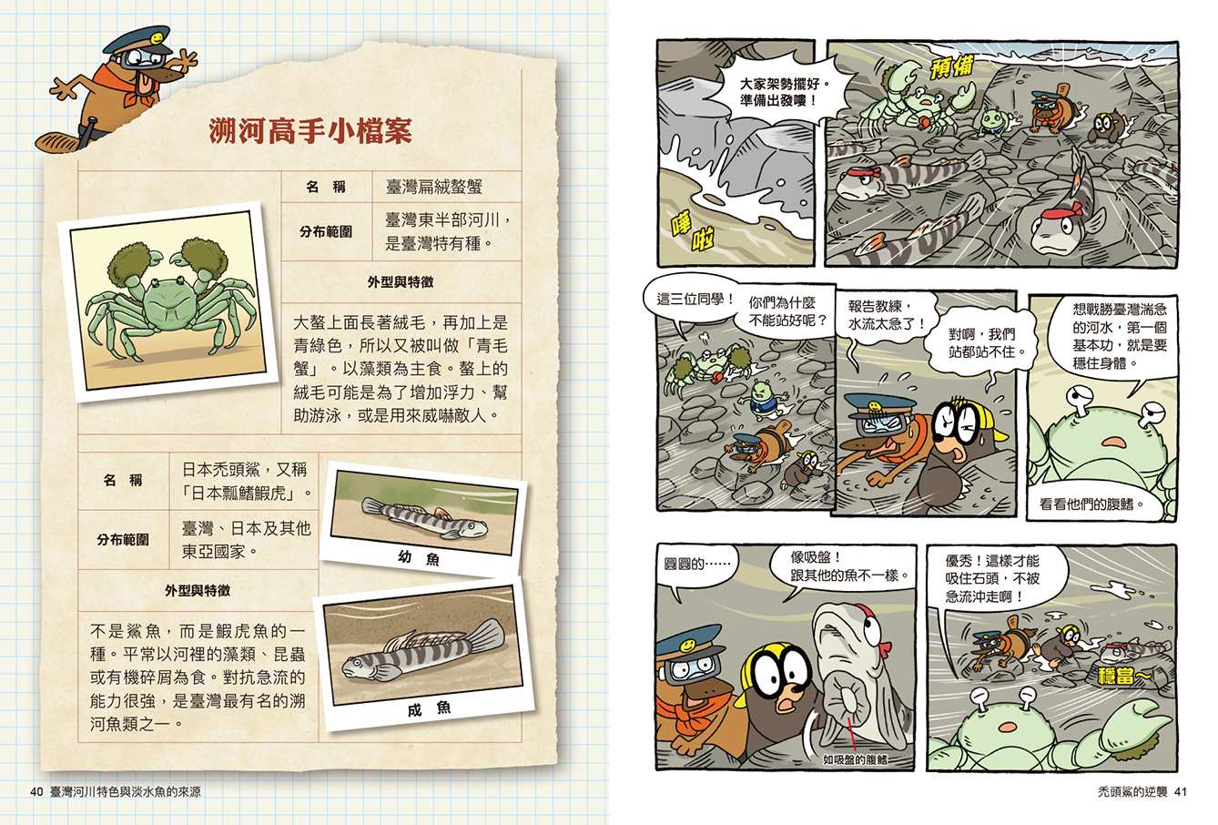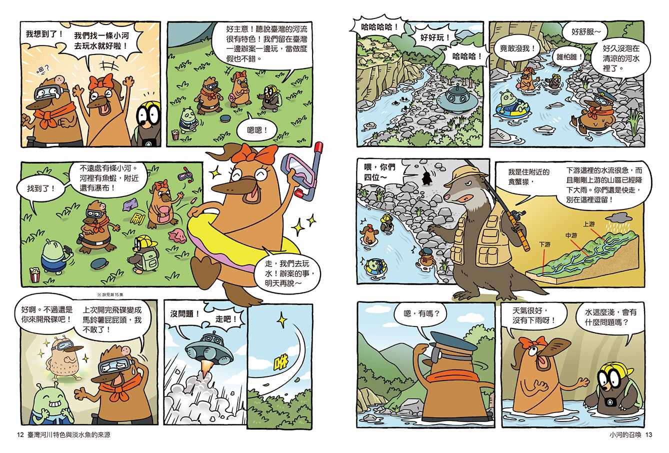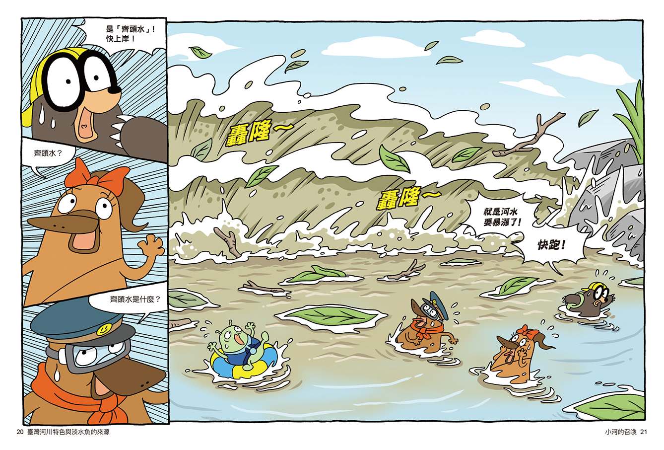 尤其是從第15集開始,動物警察達克比展開橫跨臺灣的地科、生物等跨領域的調查行動,可以說是知識界的多工偵探團。而最新推出的第16集,一開場第一章就帶出臺灣東西兩側河川的地形特徵,再透過達克比一行人在冒險中遇到臺灣河域常見的生物群,讓生硬的地球科學、生物學知識,瞬間變得像河水一樣——流暢又沁人心脾。